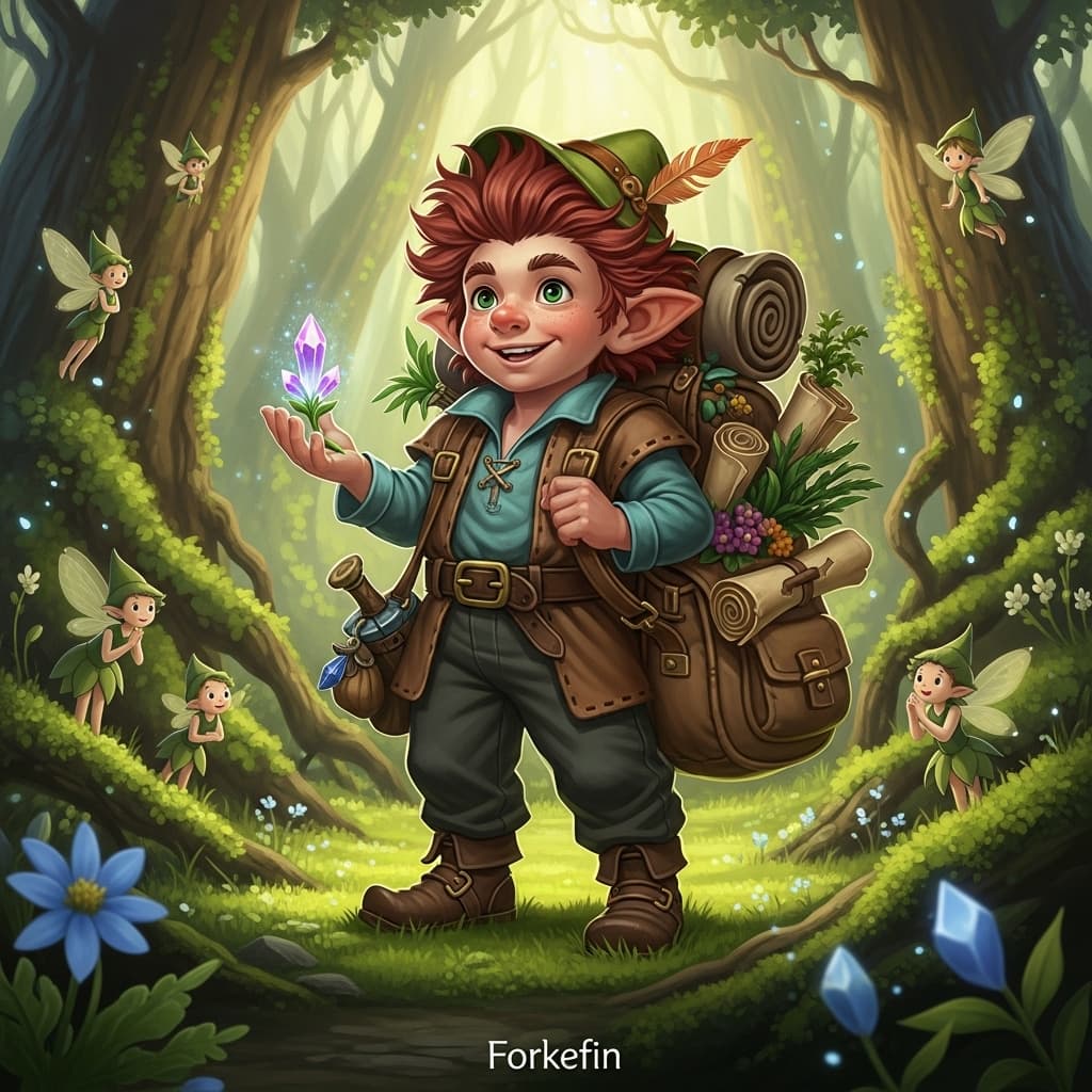 Forkefin é um gnomo da floresta que viveu quarenta e três invernos entre livros, dificuldades e gargalhadas. Filho do bardo Binbal e da maga ilusionista Kindin, cresceu nas fronteiras das cavernas dos exilados Zentharin, aprendendo sobre cura, magia e comércio.